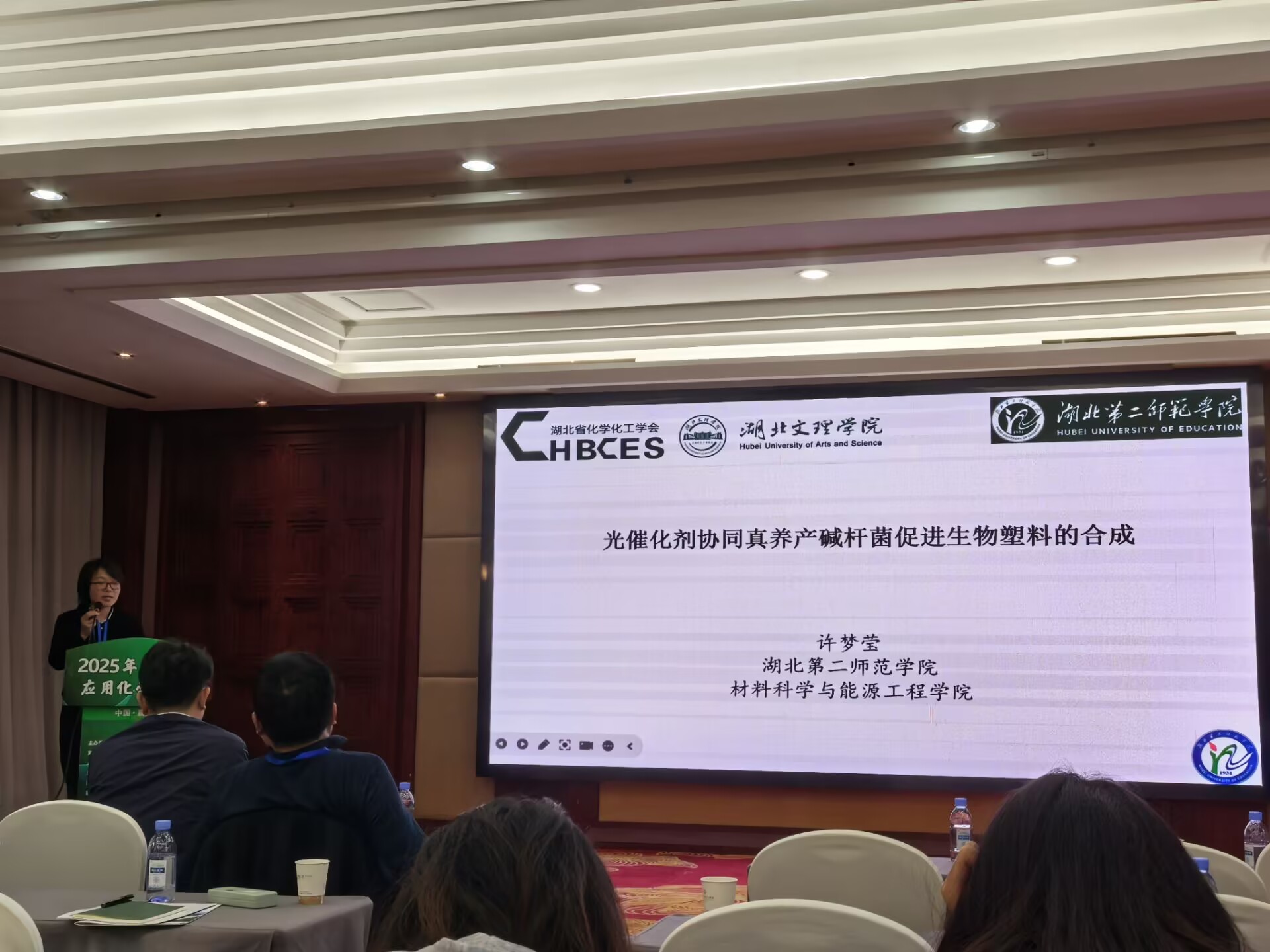 会议期间,各项学术交流活动精彩纷呈。在专题报告环节,许梦莹老师代表团队作了题为“光催化剂协同真养产碱杆菌促进生物塑料的合成”的精彩学术报告。该研究聚焦前沿交叉领域,探讨了如何利用光催化技术与微生物发酵过程高效结合,推动生物可降解塑料的合成,其创新性的思路与扎实的研究成果得到了与会专家的广泛关注和热烈讨论。